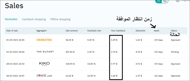 بعد اشتغال الروبوت سيبدأ بصرف المبلغ على اعلانات متعلقة بالكاش باك، وعند نهاية المبلغ سيتوقف الى حين الإيداع مجددًا. ستجد في خانة sales ل الكاش باك المقبولة وزمن الانتظار الى حين تحول الرصيد من معلق الى متوفر.