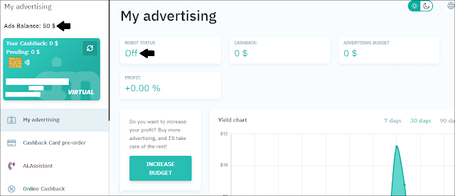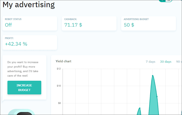 لمن لا يعرف الكاش باك فهو نظام توفره المواقع للسماح لمن يشتري باستعادة نسبة من الأموال من مجموع ما يدفعه، وبالتالي فإن موقعنا لليوم يوفر لك الحصول على نسبة من الأموال أنت أيضًا عندما يقرر أحدهم أخذ كاش باك من رابطك، وبما أن التسويق للرابط بطريقة مجانية لا يجدي نفعًا يمكنك الترويج مباشرة من خاصية الذكاء الاصطناعي، إذ ستقوم بإيداع 100 دولار وبعد شهرين ستحصل على 160 دولار أو أكثر أو أقل (لأن الموقع ليس قمار أو محرم فقط تكلف روبوت بعمل إعلانات وتدفع له).