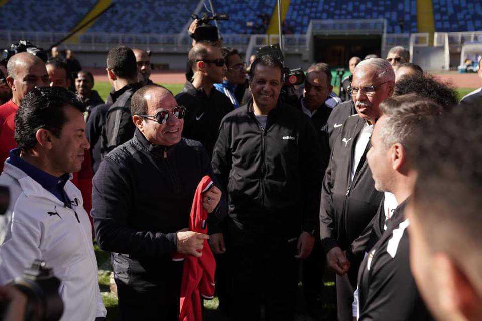 وكان فى استقبال الدكتور أشرف صبحى وزير الشباب والرياضة ، وشاهد الرئيس السيسى التدريبات الصباحية لمنتخب مصر الأول لكرة القدم الذى يشارك فى كاس افريقيا الذى يقام يوم 13 يناير 2024 بأبيدجان وعلى رأسه جمال علام رئيس الاتحاد المصرى لكرة القدم وأعضاء مجلس الإدارة وقام الرئيس بتحية اللاعبين الذى وعدوه بالفوز بالبطولة وحمل الكاس الأفريقية ، والتقط الصور التذكارية مع لاعبى المنتخب الوطنى .